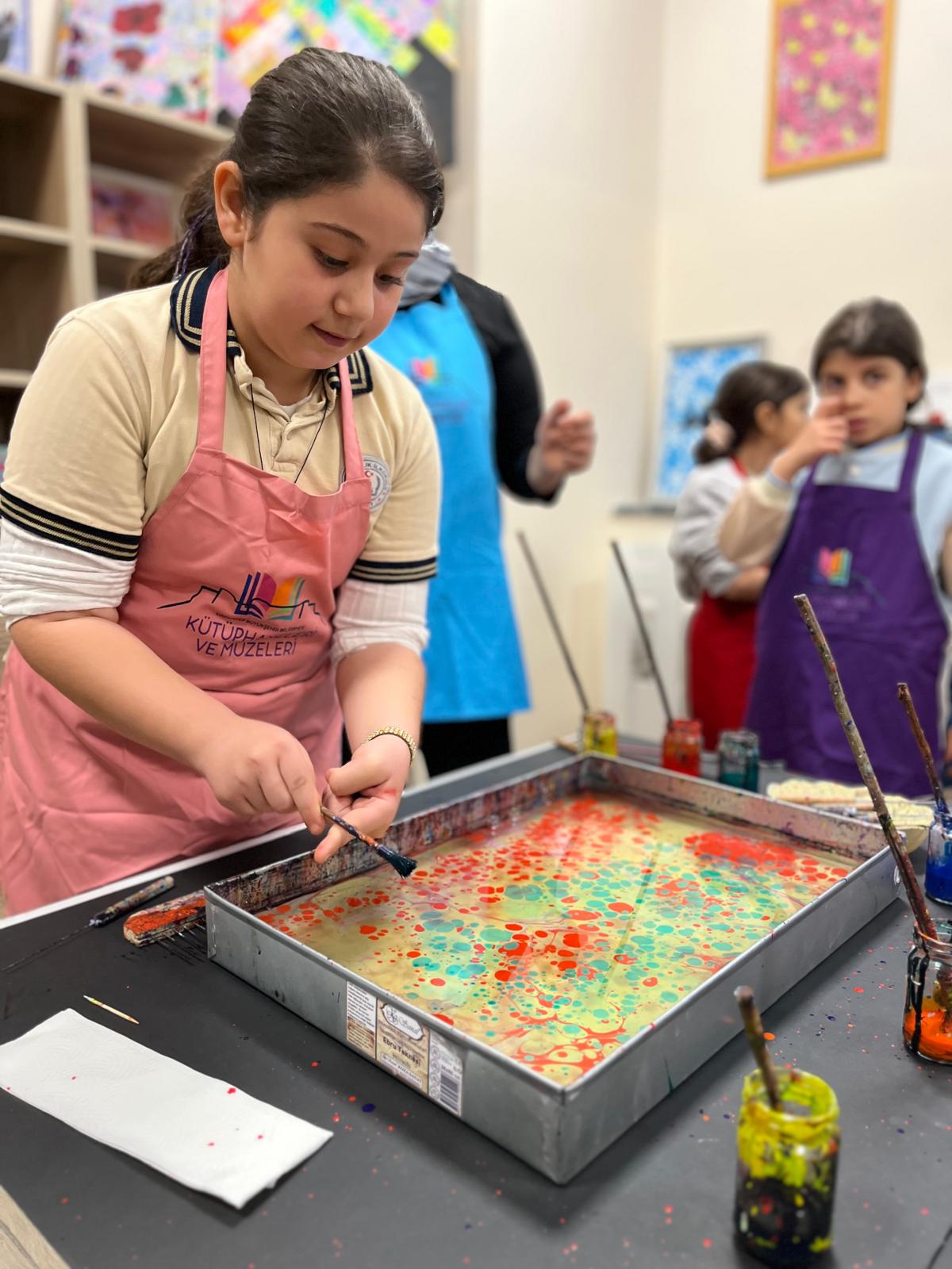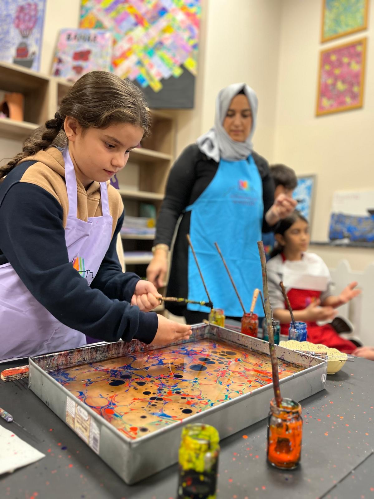 Çocuklar, suyun üzerinde oluşan renkli desenleri gözlemleyerek kendi ebru çalışmalarını yapma fırsatı buldu. Programda, ebru sanatının kültürel mirasımız açısından taşıdığı önem ve geleceğe aktarılmasının gerekliliği vurgulandı.